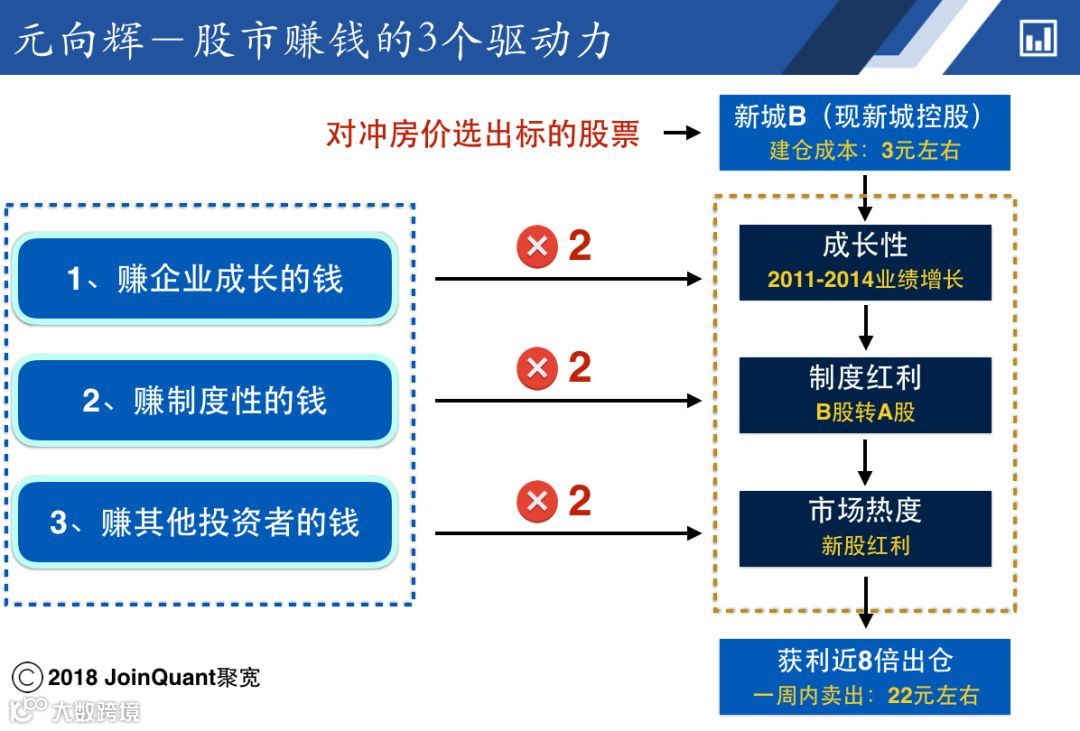 本来是5倍市盈率的股票,到了A股,它可能变成20倍市盈率。赚企业的钱,获得了2倍的回报,赚咱们国家制度的钱,获得了2倍回报,赚其他投资者对这种新股的追捧又获利2倍,2乘以2再乘以2,等于8,最终这个股票一共获得了8倍的收益。元向辉在一周内出清了手里的股票,锁定了这8倍回报。