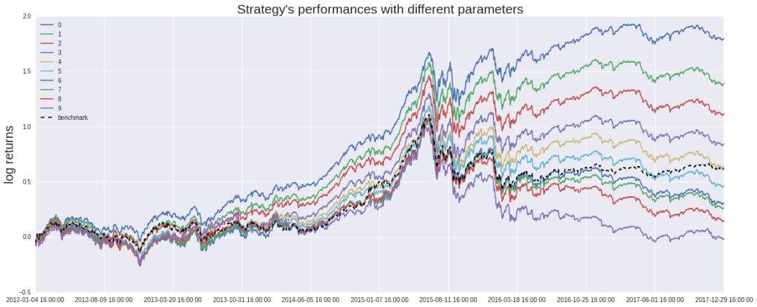 从图像中我们可以清楚地看到,无论基于哪种回归算法,我们都能得到单调的分档超额收益率,而其对数收益曲线界限也非常明朗,这证明了该因子在该段时间内是显著有效的,这也就意味着如果我们采用纯多头策略,买入残差排名更靠前的少数股票,将会拥有更大的套利空间,本着这样的想法,我们修改策略为,对中证全指股池中的全部股票进行回归,调仓周期为十天,每次调仓时买入(或继续持有)因子排名在前十位的股票,若股票的排名偏离这个区间,则卖出。