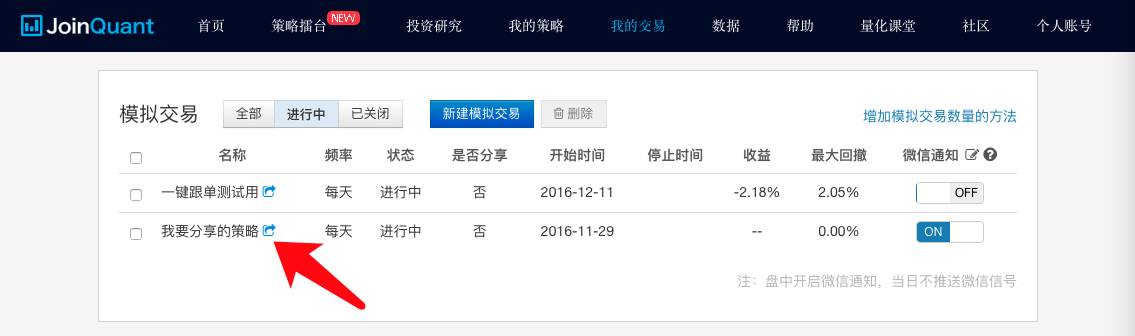 每个交易日16:00,根据从2017年1月1日至当天的累积收益,系统将对平台所有被分享策略进行排名(排名更新时间为每个交易日的18:00)。