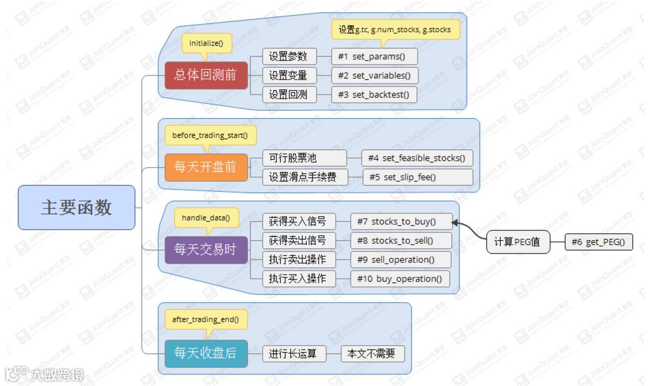 1.取市盈率和收益增长率数据时,应该取回测当天的前一天的数据,避免未来函数。在聚宽平台,取数据函数get_fundamentals时间默认值是回测前一天,保持默认即可,不建议修改。