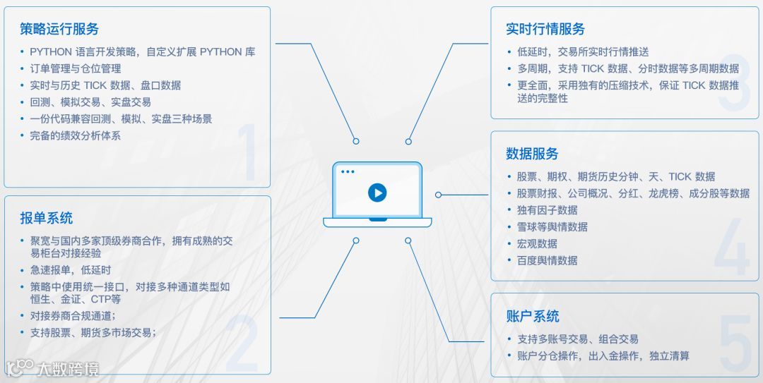 聚宽与国内多家顶级券商、期货公司合作,拥有成熟的账户清算系统、实盘交易柜台对接经验。因此我们一期会先将账户系统放置在云端,保证账户分仓操作、独立清算的准确性,并且确保实现低延时报单与风控管理。