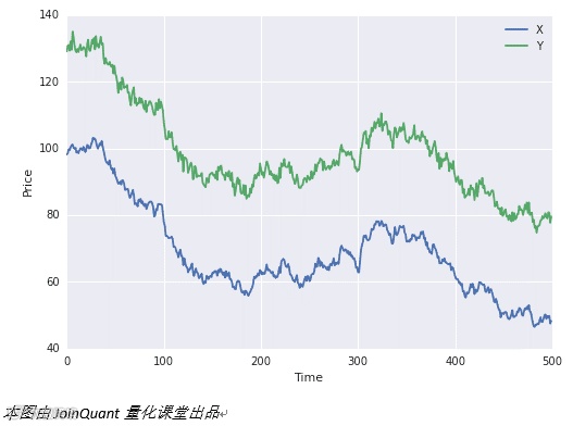 np.random.seed(100) x = np.random.normal(0, 1, 500) y = np.random.normal(0, 1, 500) X = pd.Series(cumsum(x)) + 100 Y = X + y + 30 for i in range(500): X[i] = X[i] - i/10 Y[i] = Y[i] - i/10 plot(X); plot(Y); plt.xlabel("Time"); plt.ylabel("Price"); plt.legend(["X", "Y"]);