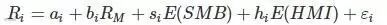 为市场相对无风险投资的期望超额收益率,E(SMB)是小市值公司相对大市值公司股票的期望超额收益率,E(HMI)则是高B/M公司股票比起低B/M的公司股票的期望超额收益率,而最后一项是回归残差项。