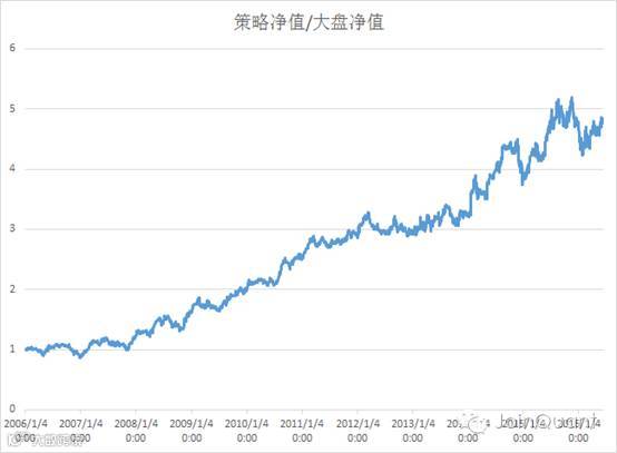 这个策略的Alpha高达18.4%,而且beta非常接近1,因此可以使用沪深300指数来对冲市场风险从而获得超额收益,下图表示这个策略的净值和沪深300组合的净值的比值: