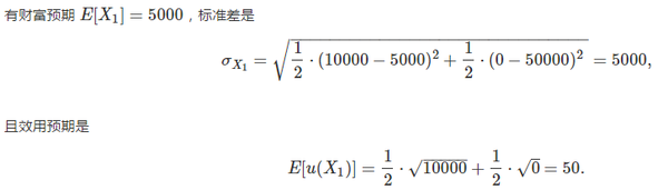投资的风险就是它的收益的不确定性。任何投资 X 都可以被写为预期收益 E[X] 和零收益投资 X−E[X]两部分的加和。其中零收益部分带来预期效用下降,所以需要足够大的 E[X] 来弥补;这里,E[X] 被定义为这项投资的风险溢价(risk premium),只有当风险溢价高于风险所带来的效用折损时,投资者才愿意进行投资。下面举一个例子。