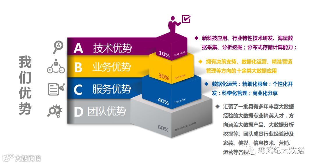 汇聚了一批具有多年丰富大数据经验的大数据专业精英人才,方向涵盖大数据产品、大数据分析挖掘等。团队成员行业经验涉及家装、传媒、信息技术、营销、运营等各领域