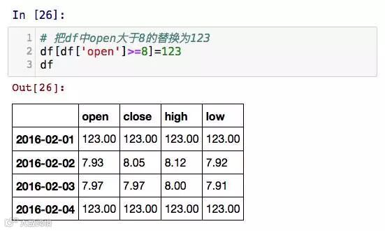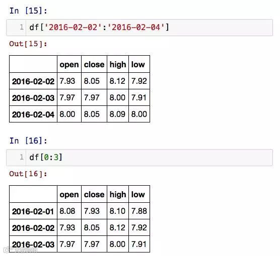 备注:当以标签名选取不连续的某几行的时候在这个例子中如df.loc['2016-02-02','2016-02-04',:]这样写会出错,,是时间格式的原因,这样写就可以了df.ix[[pd.Timestamp('2016-02-02'), pd.Timestamp('2016-02-04')]]