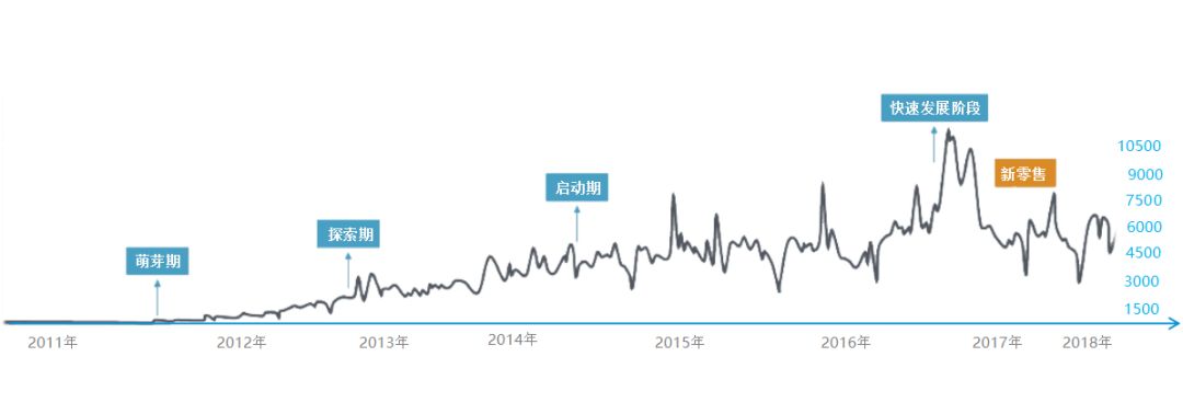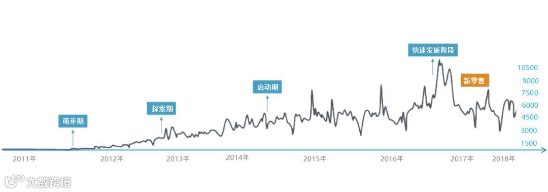 “大数据”一词的百度搜索指数在一定程度上可以体现其相关概念和产业的几个发展阶段: 萌芽期、探索期和市场启动期,目前大数据产业已进入快速发展阶段,实现了市场接受度提高、应用深化和市场规模快速增长等目标。而“新零售”概念的提出为大数据培育了新的增长点。