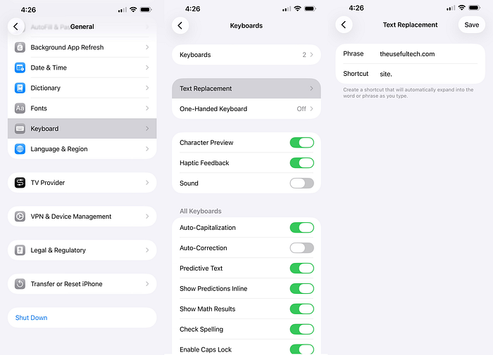 苹果的自动更正系统经常把我想打的词改成不相关的东西,尤其是我常打的语言被拉丁字母、技术名词或人名顶替,这些被改得莫名其妙,我们有两个办法,要么装第三方键盘比如 Gboard,要么干脆关掉自动更正,我更习惯苹果自带键盘,所以我选择把 Auto-correction 关掉,同时把键盘声音也关了,省得在公共场合尴尬。