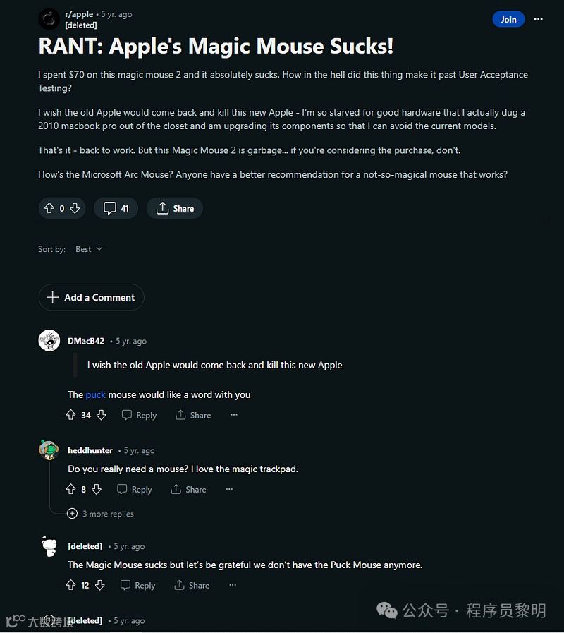 回想我刚入职的时候,公司给我配了台 MacBook Pro,还让我选配显示器、键盘和鼠标。我的同事和领导都对 Apple 配件非常熟悉,用得毫无怨言。但当我拿到 Magic Mouse 的时候,我就开始思考:为什么它会让我手掌疼?为什么点击这么别扭?是我不会用吗?