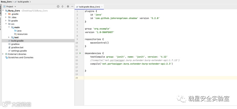 新建完后,在 build.gradle 文件中添加以下依赖,也就是加载 burpsuite 插件API ,自动从远程仓库加载 burpsuite API 。