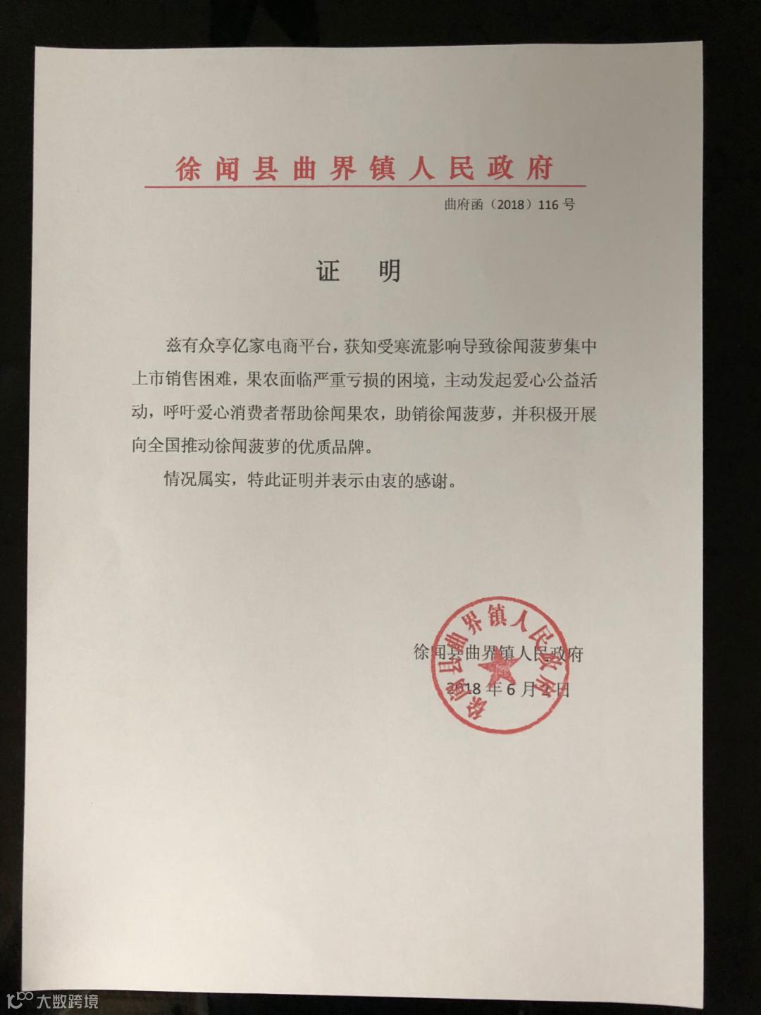 众享亿家平台自成立以来一直倡导“成人达己”的企业价值观,提倡“以利己之心利人,心怀感恩,成就他人,达成自己。”众享亿家此次紧急助农行动与赚钱无关、与名誉无关!众享亿家的创始人只是单纯地希望通过这次徐闻滞销菠萝的助销行动,可以尽平台的一份绵薄之力帮助当地的果农解决菠萝滞销难题,让果农们的辛勤付出不至于全都付诸东流。众享亿家下定决心采购菠萝的时候就明确了此次助农的定位:平台将以亏本售卖的方式完成助农行动,只要能帮助当地的果农将菠萝滞销的损失降到最低,众享亿家愿意承担其中的亏损。此举不仅获得了当地政府的感谢,也是众享亿家回馈社会的切实行动,毕竟众享亿家能发展到今天的规模,依靠的也是全国各地消费者的一路支持。