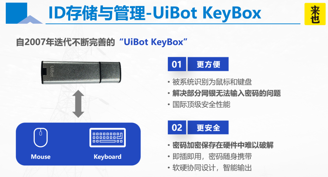 比如上图中来也科技的一款产品-UiBot KeyBox,就是采用软硬件联合加密的方式,将密码加密保存在硬件中,此硬件仅有普通U盘大小,适合随时携带,确保在不能拿到此硬件的情况下,密码不能泄露。即使拿到硬件,由于软硬件的联合加密,对密码的破译也需要很复杂的技术手段,难度极大。