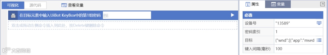比如上图中使用UiBot 设计器里面的组件-在目标中输入密码,就可以把密码密文存储在组件里面,但安全性最低,因为一旦流程泄露,就可以通过目标选择输入在txt文本框里面获知密码。