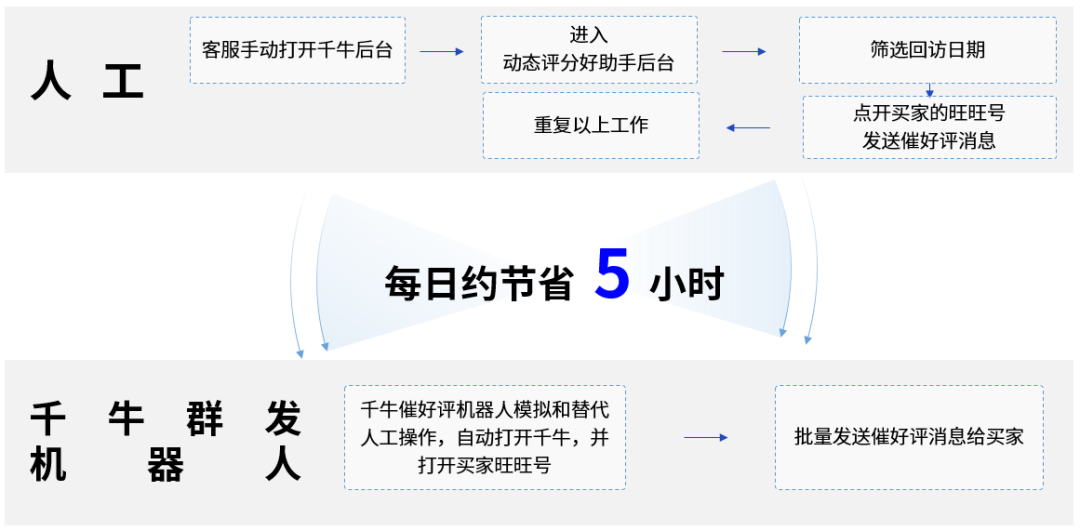 目前该公司拥有100人左右的客服团队,专门为淘宝/天猫商家,提供催好评、活动群发等服务。每个客服人员每天需要群发大约3000条消息。