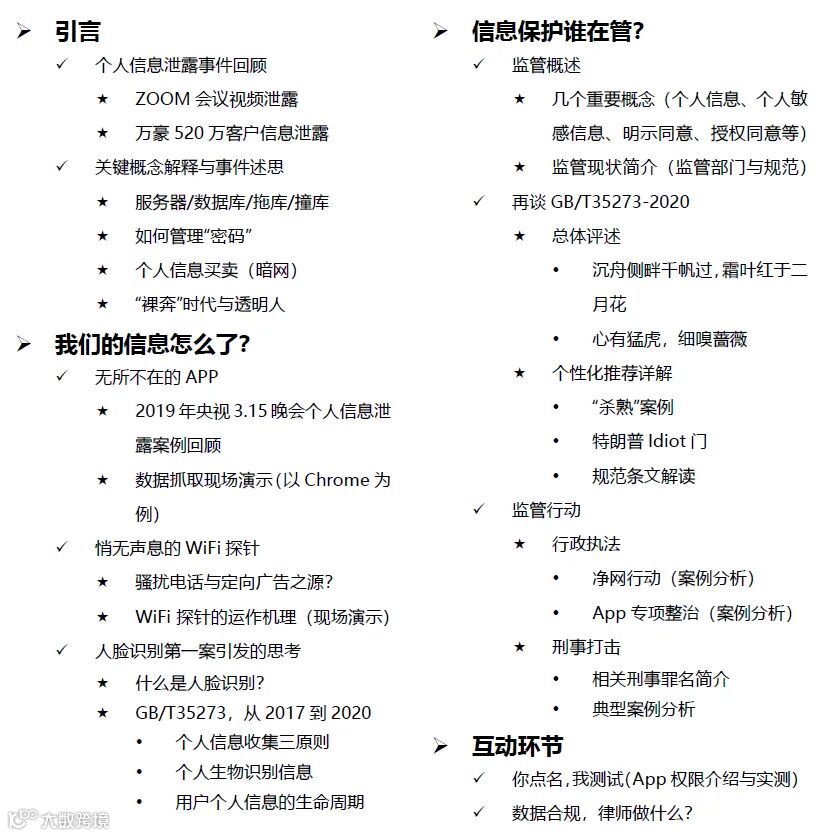 爬虫、特朗普Idiot门、大数据杀熟、人脸识别、WiFi探针、GB/T35273、Zoom会议视频泄露、暗网、个人信息生命周期、净网行动……