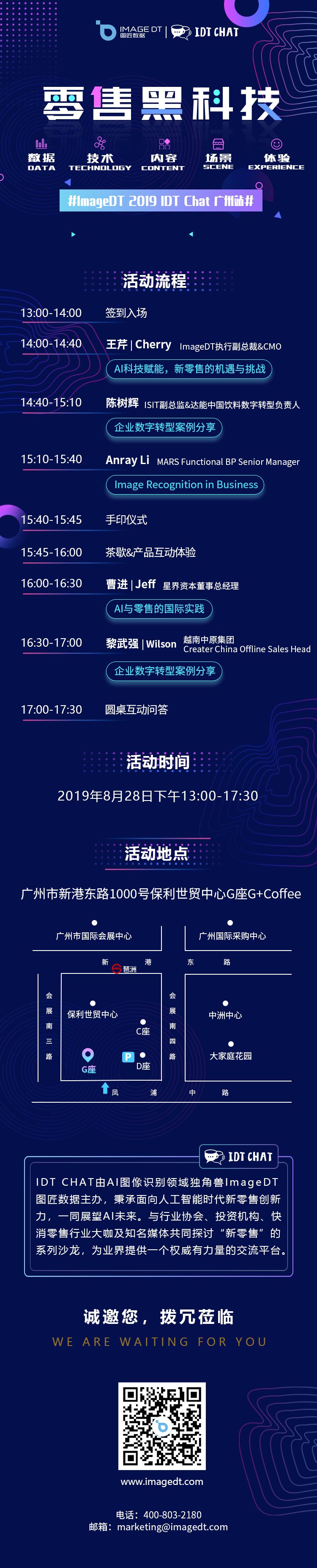 在此,ImageDT图匠数据诚挚地邀请您参加于 2019 年8月28日在广州市保利世贸中心G+Coffee举办的“零售黑科技”主题沙龙,与在场的众多嘉宾一起畅所欲言,共同聆听与分享零售行业的点滴,并见证强大的黑科技带来的真正行业形态升级。