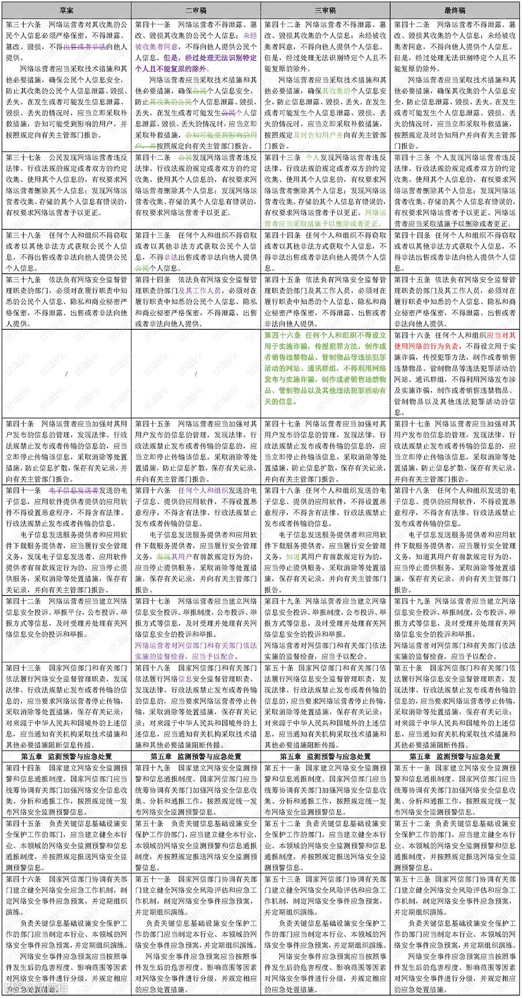 从1994年的我国第一部成文的计算机安全保护法规《计算机信息系统安全保护条例》开始,到2017年《网络安全法》正式施行,网安立法经历了漫长的20多载。《网络安全法》的落地,从草案到终稿,法规本身就经历了四个版本的更迭,现将四版本网安法全比对如下:(友情提示:横屏观看更方便哦)