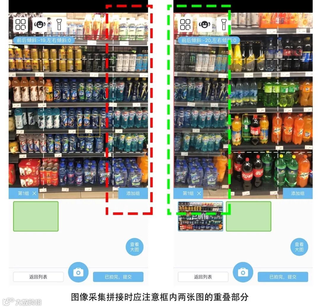 “智能货架识别”该技术主要是通过AI技术来实现货架信息及商品特征的收集和识别。在该技术中,用户通过手机中的APP,对自然场景进行数字化采集,受限于客观条件限制,如货架的长度、高度、场地大小及手机拍摄镜头等,很难一次性完整获取到整个场景的照片,实际的做法是分批采集不同场景片段,并通过图片拼接的方式来完美还原货架整体情况。