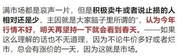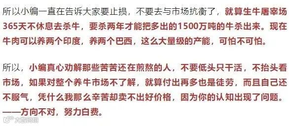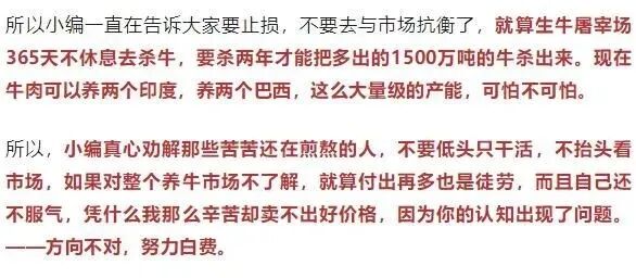 但,我们要看你手中的牛的成本和你养殖的成本,还有未来牛价的发展趋势来进行你的操作,对不对?不能因为价格低就一味去搏未来的涨价,这样会让你的成本越来越高,而且正是因为这样的想法,过量的牛就不会快速的去产能,那么离涨价的时间就会越磨越远。