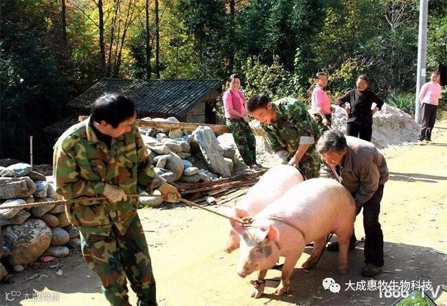 2、猪耳朵好使:赶猪时,用一根长一些的杆子击地,猪听到声音会听指挥;后面有声音它往前走,左面有声音它向右拐。