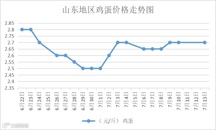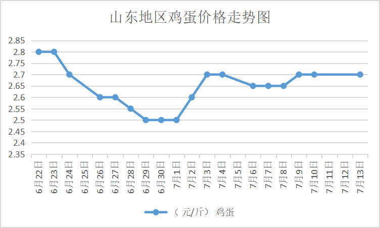 7月13日,山东地区莱阳鸡蛋2.75元/斤,稳;青岛鸡蛋2.95元/斤,稳,各超市、商场等零售价3.15-3.25元/斤,稳;诸城到户2.7元/斤,稳;安丘到户2.7元/斤,稳;昌乐到户2.7元/斤,稳;寿光到户2.7元/斤,稳;昌邑到户2.7元/斤,稳;高密到户2.7元/斤,稳;青州到户2.7元/斤,稳;临朐到户2.7元/斤,稳;莱州到户2.75元/斤,稳;威海鸡蛋今天到户2.7元/斤,稳;临沭鸡蛋2.65元/斤,稳;沂水鸡蛋2.65元/斤,稳;沂南鸡蛋2.65元/斤,稳;莒南鸡蛋2.65元/斤,稳;兰陵县鸡蛋2.65元/斤,稳;日照鸡蛋2.65元/斤,稳;莒县鸡蛋2.65元/斤,稳;日照辛萁商贸鸡蛋2.65元/斤,稳;泗水鸡蛋价格79元/30斤,落;济宁、汶上鸡蛋79元/30斤,落;梁山、东平红蛋价格79元/30斤,落;枣庄滕州地区鸡蛋混码主流到户80元/30斤,落;泰安地区新泰鸡蛋价格79元/30斤,落;菏泽地区曹县主流到户收75-76元/30斤,稳;成武鸡蛋价格76-77元/30斤,落;单县到户77元/30斤,落;聊城莘县78元/30斤,落。