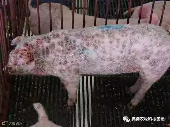 在病猪耳部、背部、腹部、前肢、后腿、臀部等部位广泛性出现各种大小不一的红斑、斑点、丘疹,圆形或不规则的隆起,呈现红色或紫色,中央为黑色的病灶,持续时间长,指压不褪色,保育猪和生长猪多发,病猪可见腹股沟淋巴结明显肿大,抗生素治疗效果不佳。