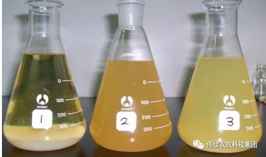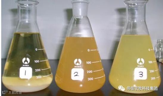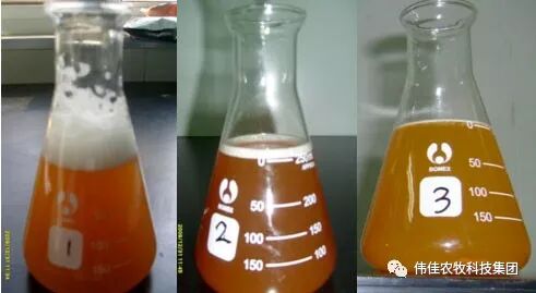 分别称5克的北京伟佳黄芪多糖、河北某厂家黄芪多糖、江西某厂家的黄芪多糖,溶解在250毫升的纯化水中的现象。
