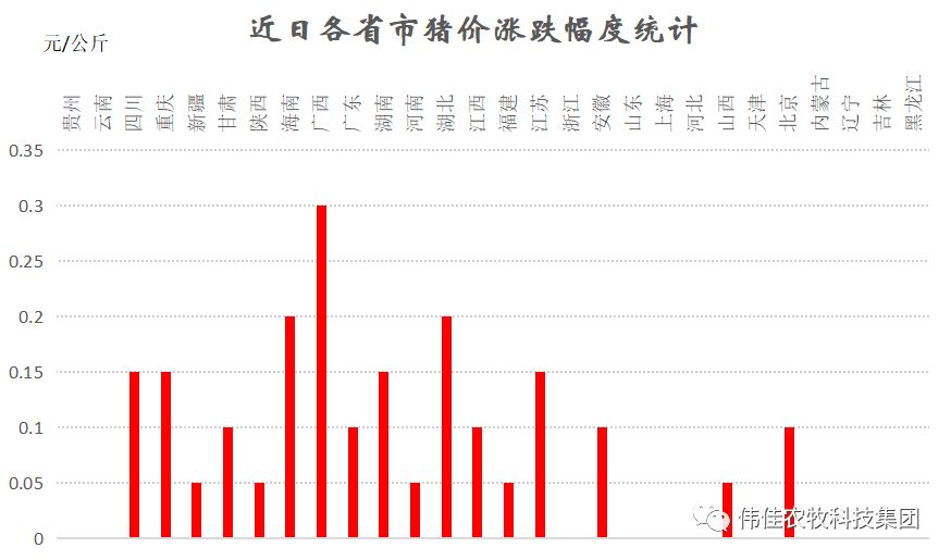 从各省市猪价看,大部分地区猪价上涨,局部稳定为主。与昨日相比,其上涨地区有所减少,但涨幅有所增加。今日广西猪价涨幅最大为0.3元/公斤,其次是湖北、海南猪价上涨0.2元/公斤;河南、福建、陕西、山西、新疆上涨幅度最小为0.05元/公斤,其他省市涨幅均在0.1-0.15元/公斤。