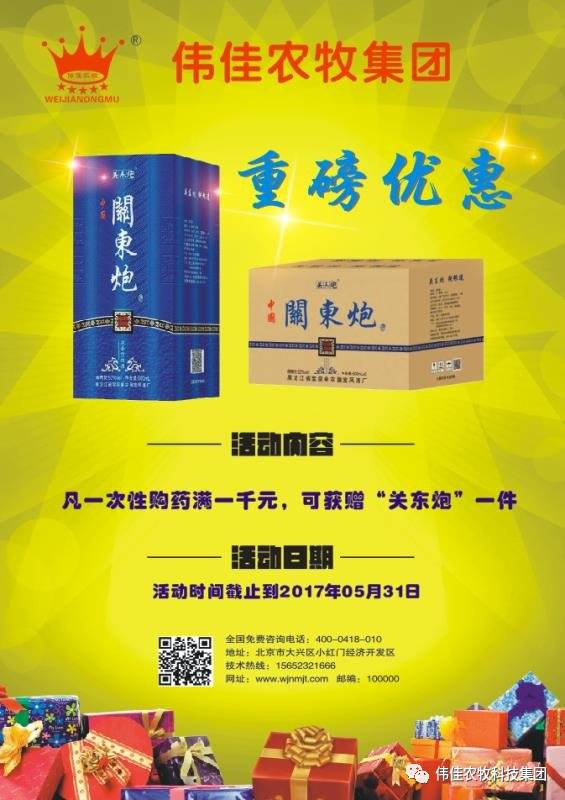 伟佳农牧最新促销:凡一次购肥霸猪国一件赠蚊蝇气雾剂一瓶,并买五赠一买十赠三;凡一次购药满680元赠五盒灭蝇王;凡一次购药满1000元赠关东炮白酒一箱;凡一次购药满1200元赠净水器一台;凡一次购药满1600元赠九阳电饭煲一个;凡一次购药满一万元赠空调一台。
