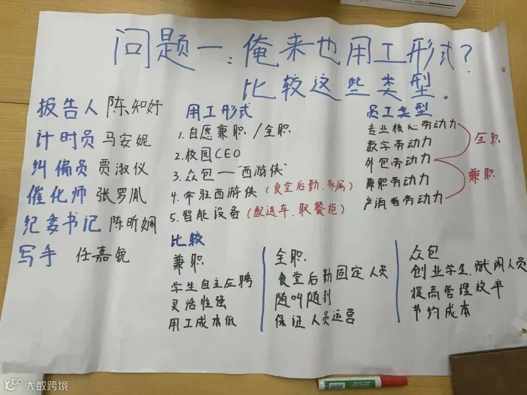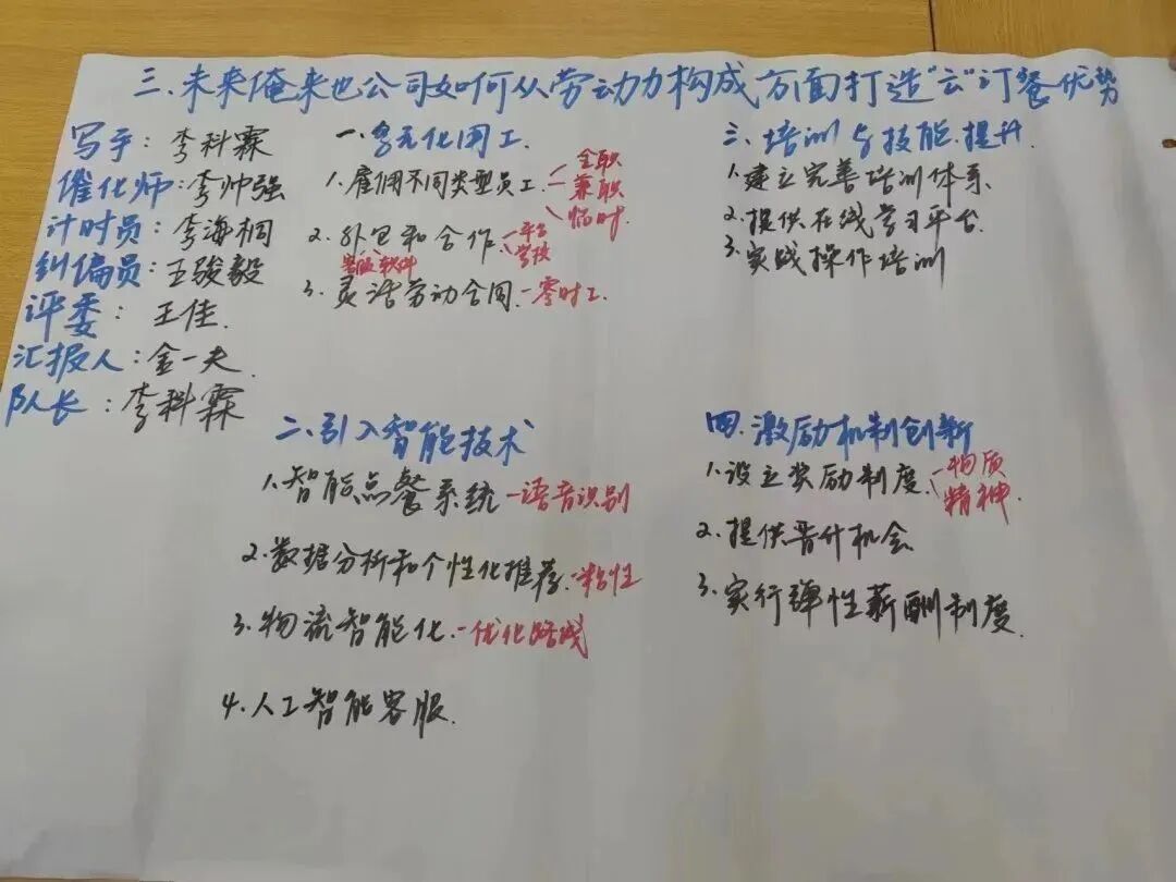 同学们被分成若干小组,围绕着几个核心问题开展深入讨论。讨论内容涉及俺来也公司的用工形式类型、为何俺来也公司不断调整其用工形式、未来俺来也公司从劳动力构成方面打造“云订餐”服务竞争优势等多个方面。通过头脑风暴和团队协作,各小组都提出了具有创造性和实践价值的解决方案。