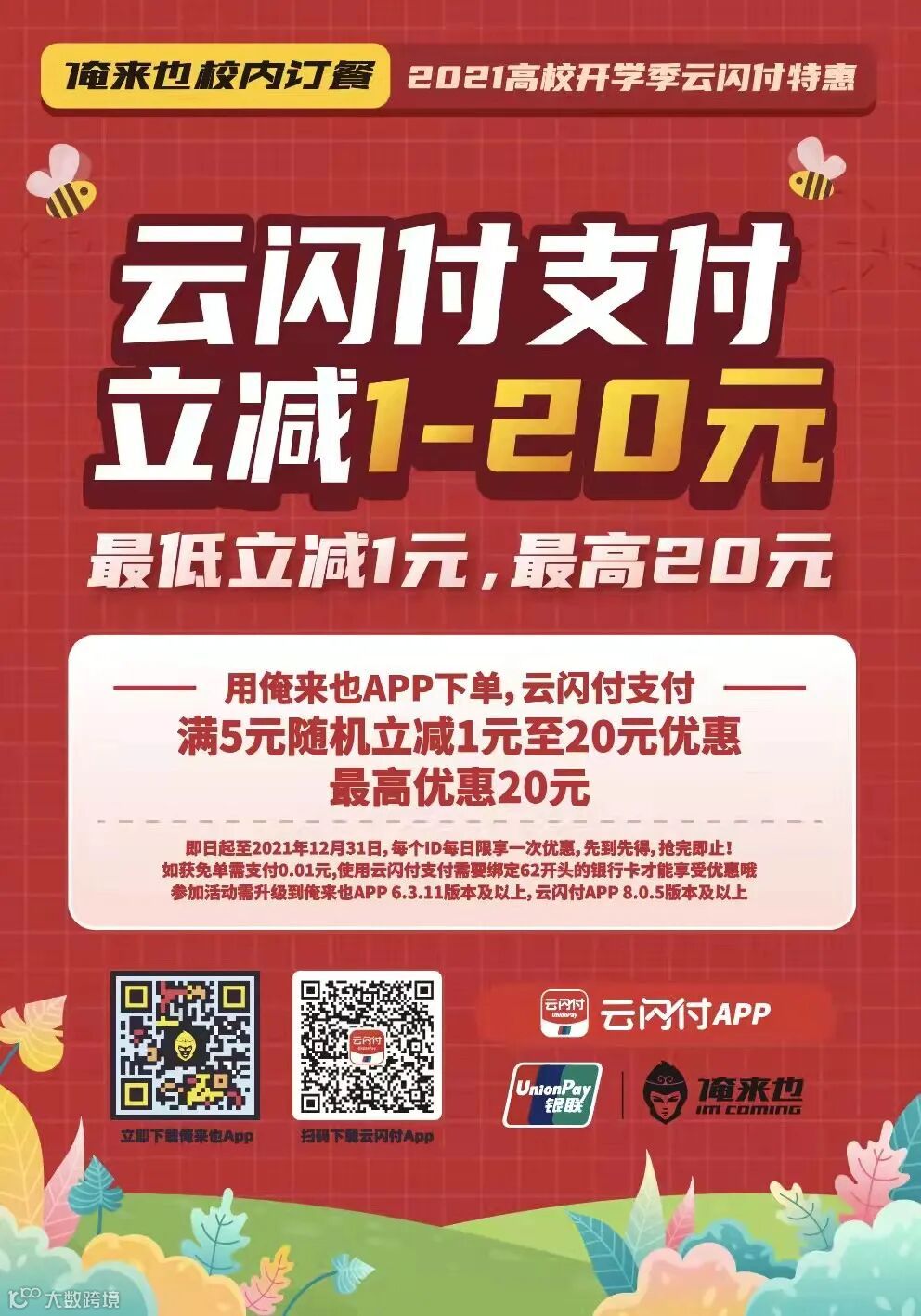 就在今天,激动人心的俺来也·双11活动来了!11月9日——11月13日,俺来也联合银联云闪付,拿出“全场5折吃饭,连嗨整5天”的大招,校园超省钱式吃饭的天花板,就在俺来也!