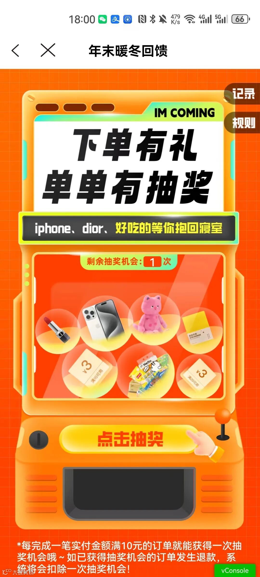 第二步:提交订单结算后,即可获得一次抽奖机会,“点击抽奖”跳转至抽奖页面参与活动。
