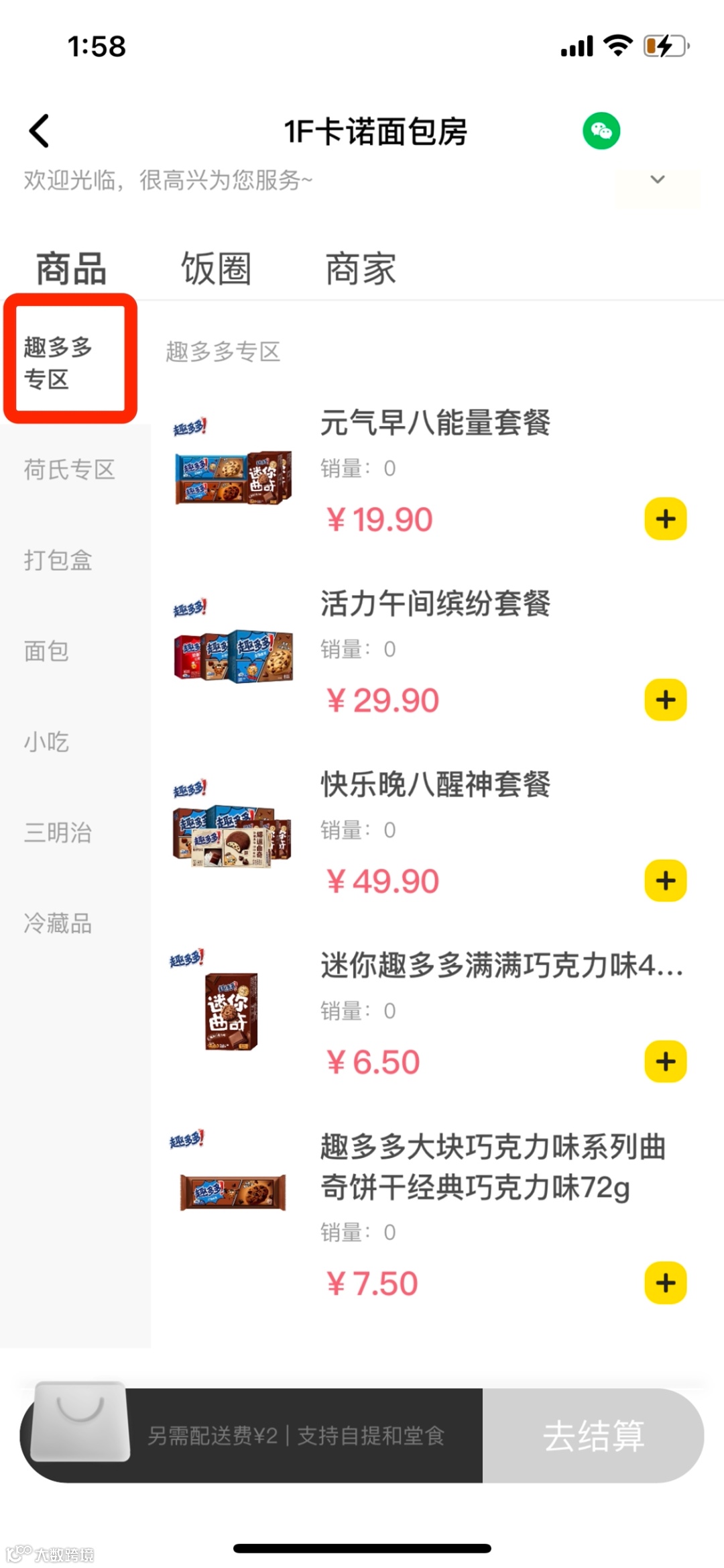 2.进入趣多多加价购活动档口专区,挑选你喜欢的档口点餐