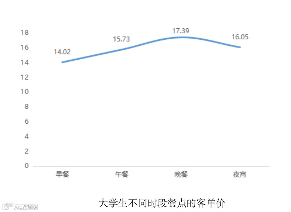 据调研显示,大学生在不同餐点的订餐波峰时间点分别是:早餐-9点,午餐-11点,晚餐-17点,夜宵-21点;餐点的客单均价为15.79元,茶叶蛋和黄焖鸡是其日常最爱的餐点。
