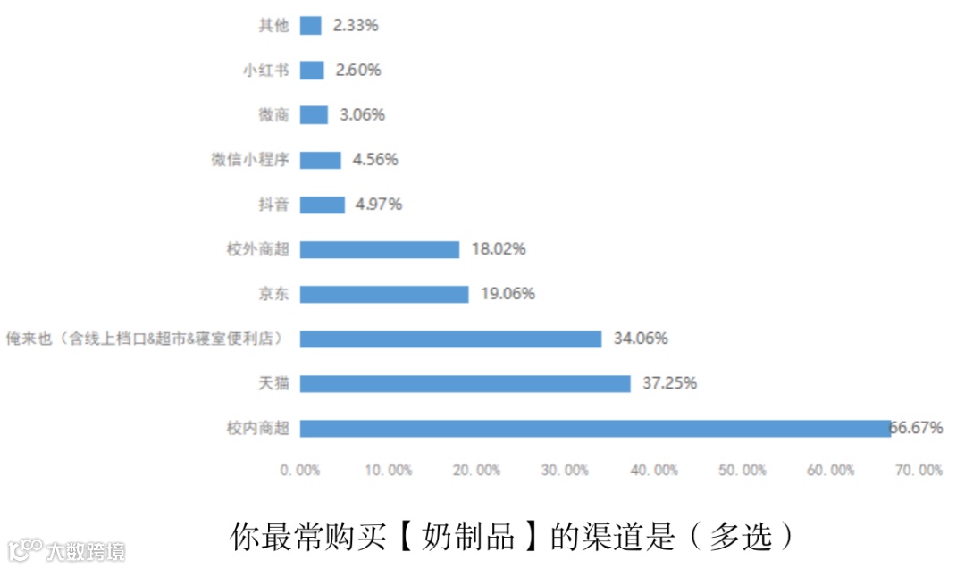 大学生更倾向在校内商超购买奶制品,其次是天猫和俺来也,亲密度越高的人推荐越能让大学生产生购买欲。