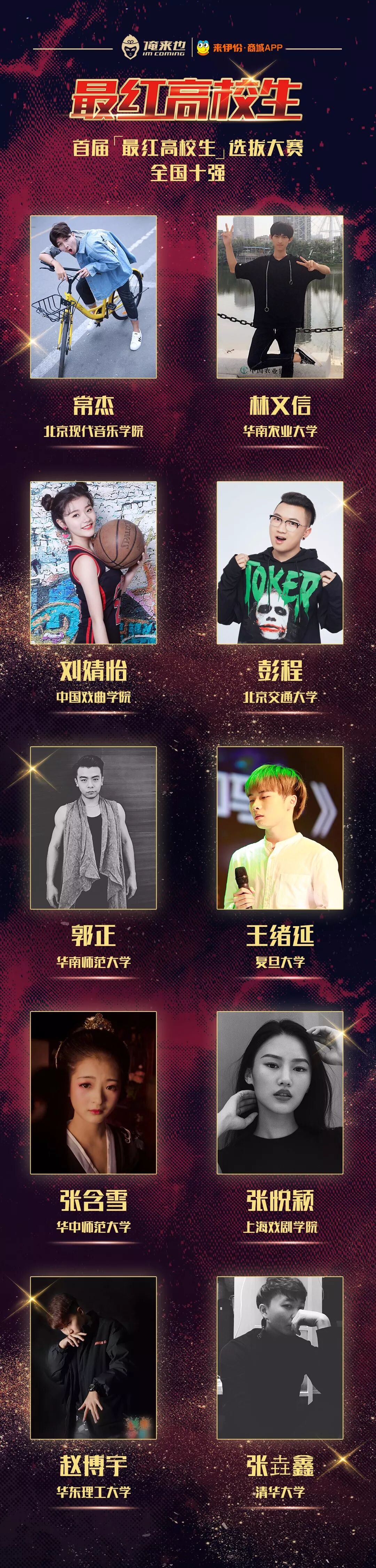 俺来也“最红高校生”大赛通过丰富的形式,展示不同高校学生的卓越才能与多面风貌,更是借由“母校荣誉”环节强化高校生对母校的情感联系与荣誉感,从多方面展示出新时代高校学生崭新风采,打造新一代的校园青春偶像。在决赛之前,回顾一下这十位选手的往期精彩!