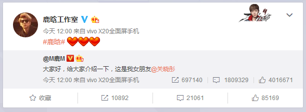 毫无征兆,毫无爆料,鹿晗用最直接的方式,公布了与关晓彤的恋情。