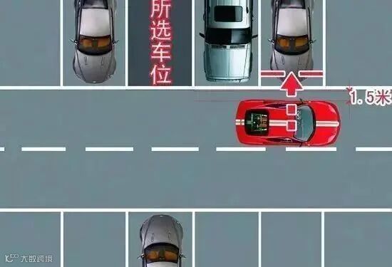 等你选中车位之后,然后车辆与车位保持1.5米左右的位置,然后再继续向前行驶两个车位左右,如图中驾驶员与相隔的车位中间垂直。