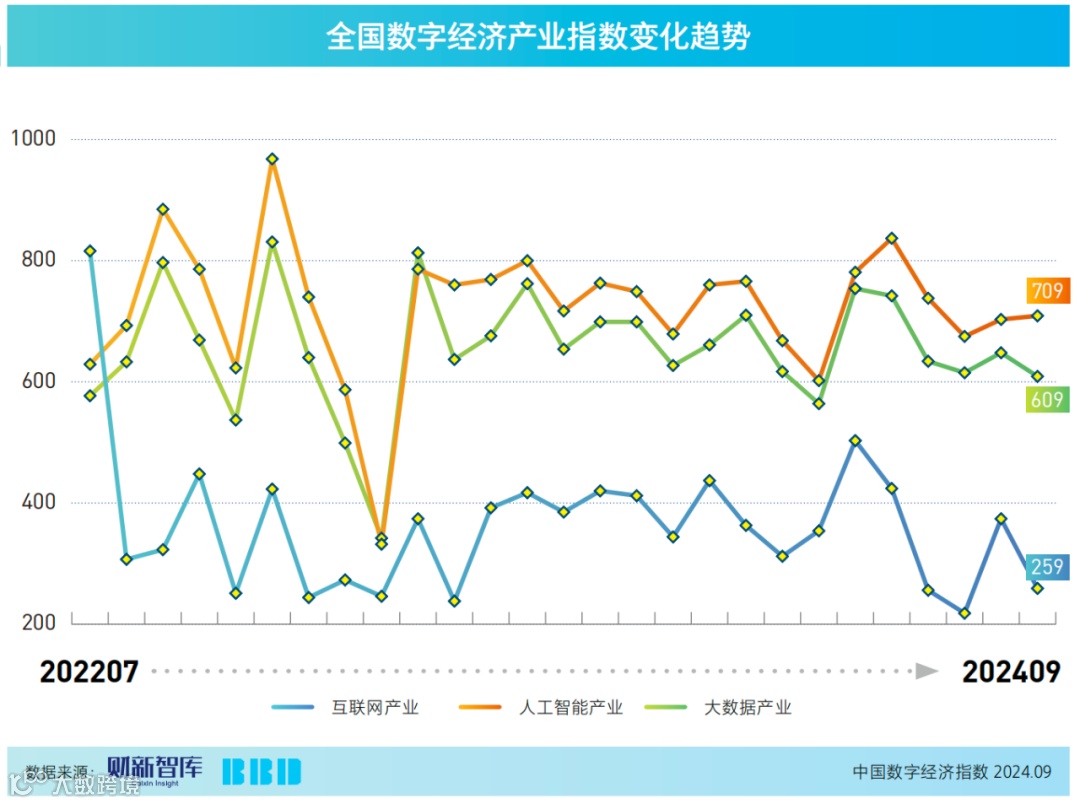 2024年9月,互联网产业、人工智能产业和大数据产业指数分别为259、709和609,环比分别变动-30.8%、0.9%、-5.9%。