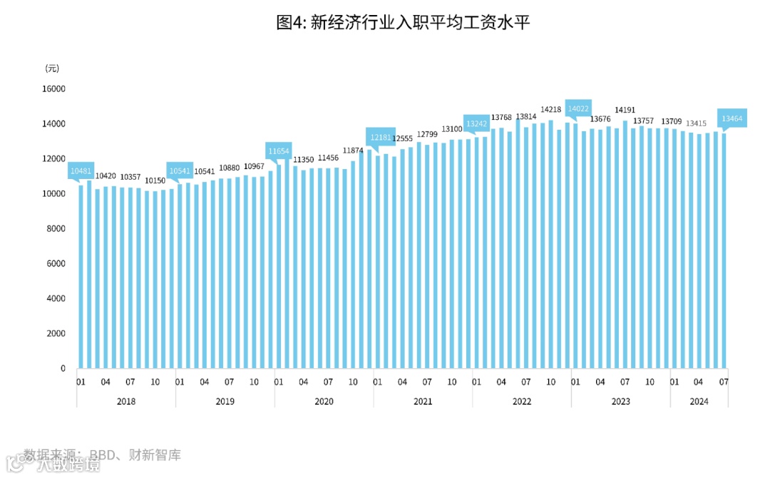 2024年7月,新经济行业入职平均工资水平为每月13464元,较上月下降99元。新经济入职工资“溢价”为新经济行业的平均入职工资与全国平均入职工资的比值,2024年7月新经济入职工资“溢价”3.1%,较上月上升0.4个百分点。新经济工资数据主要来自招聘网站的招聘信息,即对劳动力的需求工资。