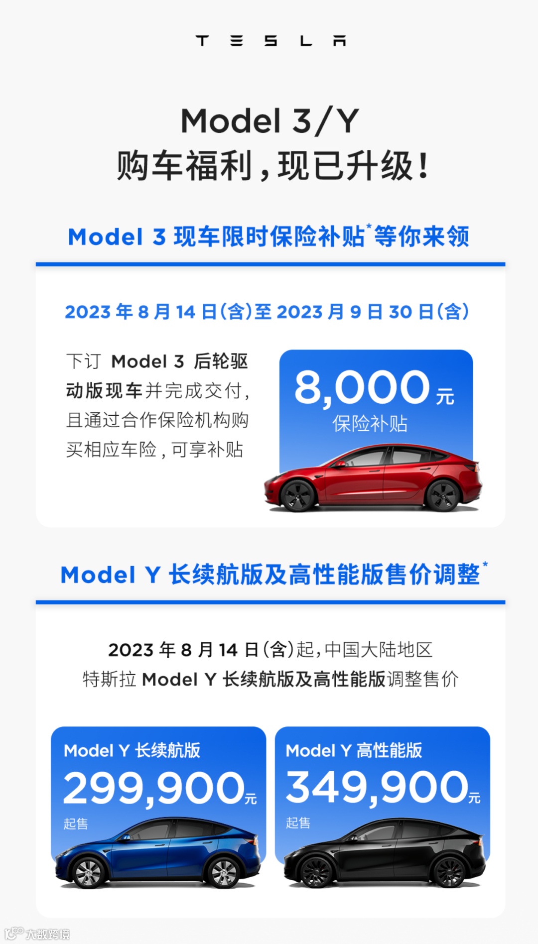 这是特斯拉3天内的第二次降价。8月14日,特斯拉刚宣布,中国大陆地区Model Y长续航版和高性能版分别降价1.4万元。Model 3虽然没有直接降价,但是给出了8000元的保险补贴,相当于变相降价3.5%。