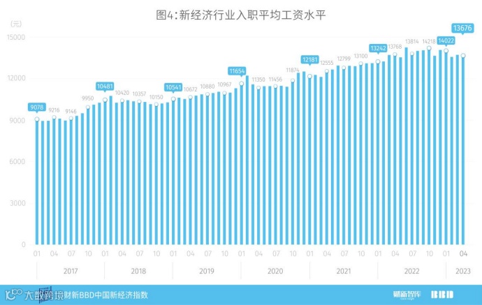 4 月,新经济行业入职平均工资水平为每月 13676 元,较上月下跌 54 元,高于全国平均入职工资水平4.6%,溢价水平较上月上升0.3个百分点。
