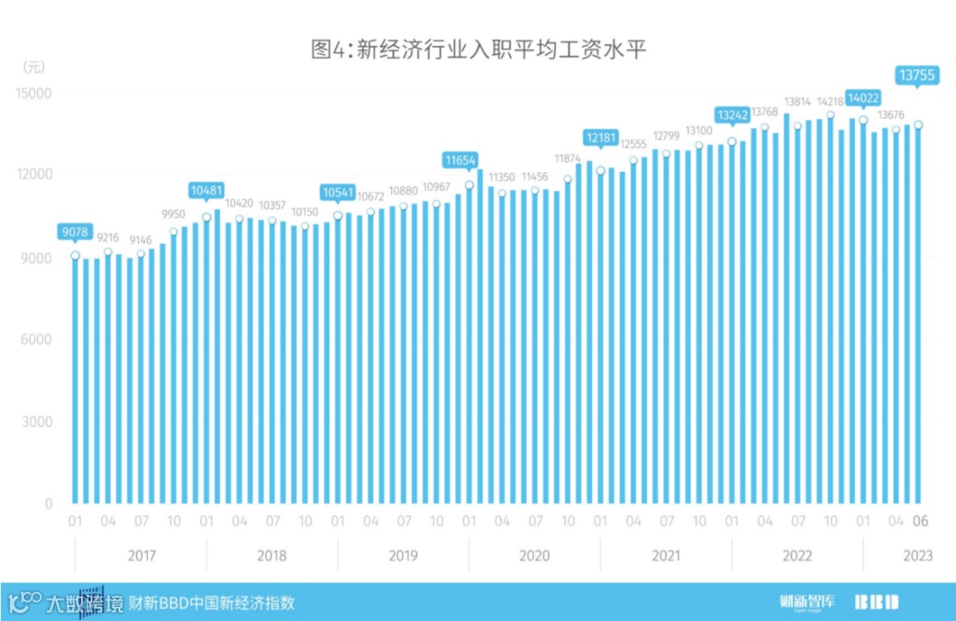 6月新经济行业入职平均工资水平为每月13755元,较上月下降97元,高于全国平均入职工资的5.1%,溢价水平较上月上升0.5个百分点。