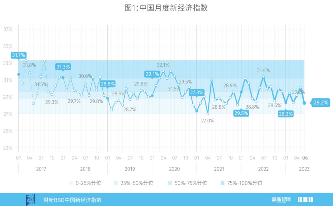 2023年6月,财新BBD中国新经济指数(NEI)录得28.2,较前月回落1.9个百分点