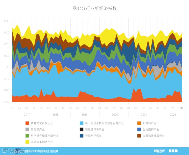 2022年11月,财新BBD中国新经济指数(NEI)录得30.0,较前月上升1.5个百分点