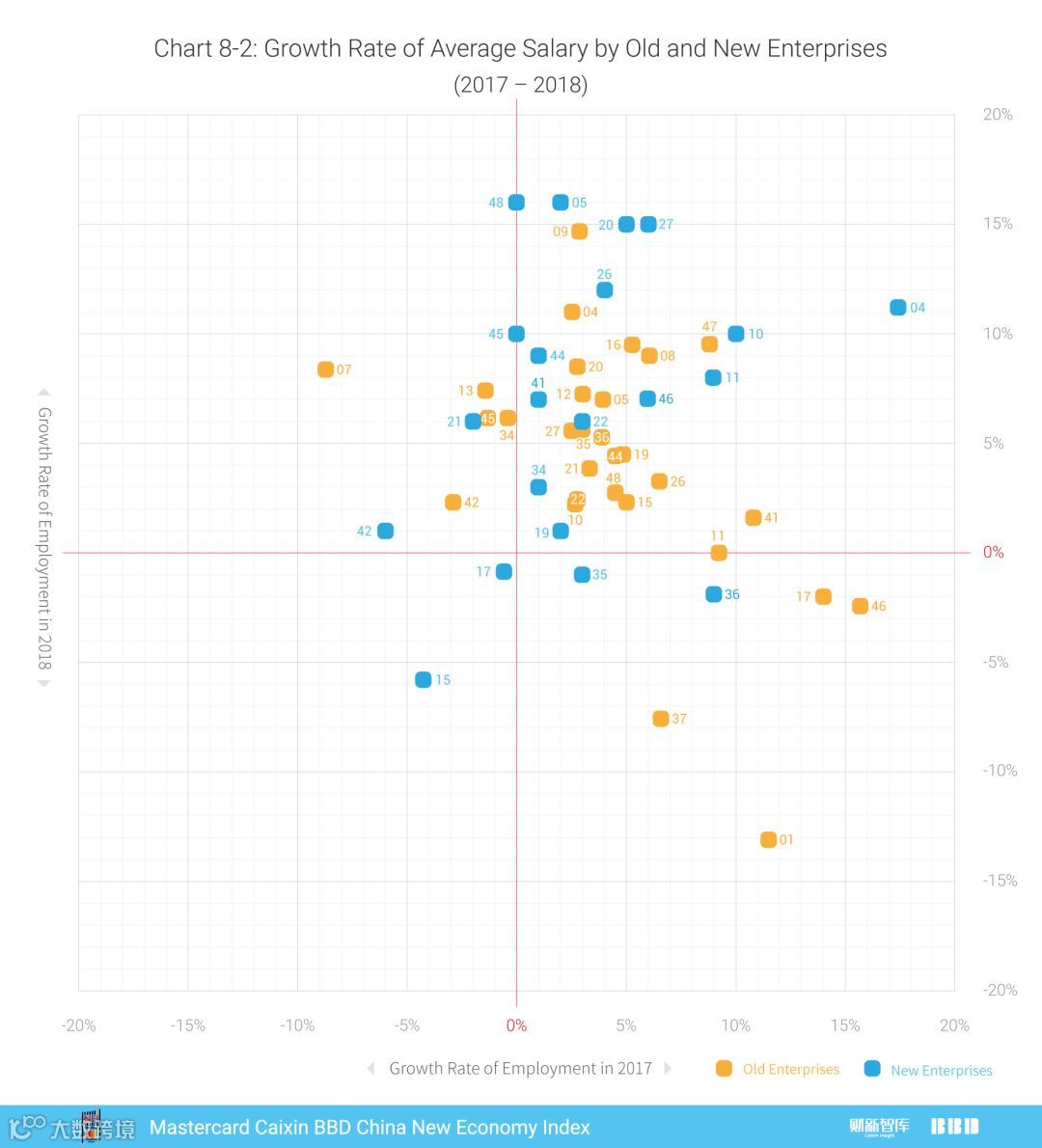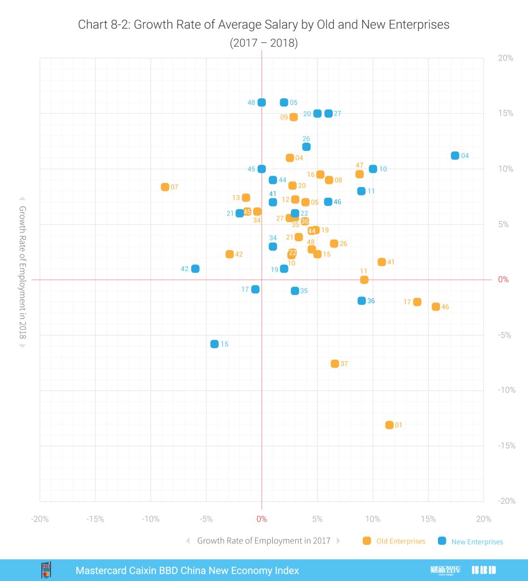 At the same time, the new enterprises were more energetic in taking place of the old ones in some industries. The few industries in the first quadrant of Chart 8-1 were the new enterprises, who expanded rapidly in the past two years and had higher growth rates of average salaries in 2018(Chart 8-2). The employment of new enterprises in Lines & Equipment Installation and Real Estate rose faster in 2017 and dropped slower in 2018. Meanwhile,average salaries of new enterprises in Lines & Equipment Installation and Real Estate increased more than four times as much as their counterparts.