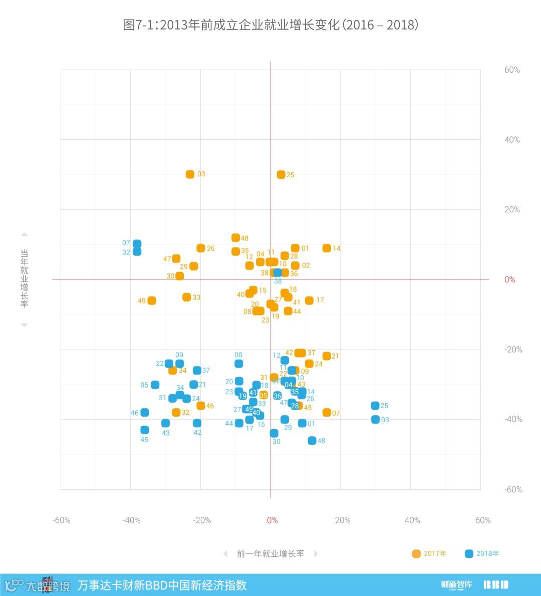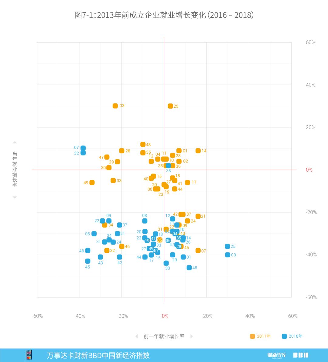 同时,新企业也展现出更强的发展活力和更广阔的市场前景,行业内部新老企业的更新替代也正在发生。就业增长率的第一象限中,为数不多的企业均为新企业,其2018年工资增幅也更高:部分新企业在2017年和2018年的发展势头迅猛。其中,建筑安装业和房地产业的新企业就业岗位在2017年的上升幅度更高、在2018年的下跌幅度更低。并且,这两个行业的新企业在2018年的工资增长率均是各自行业旧企业的4倍以上。