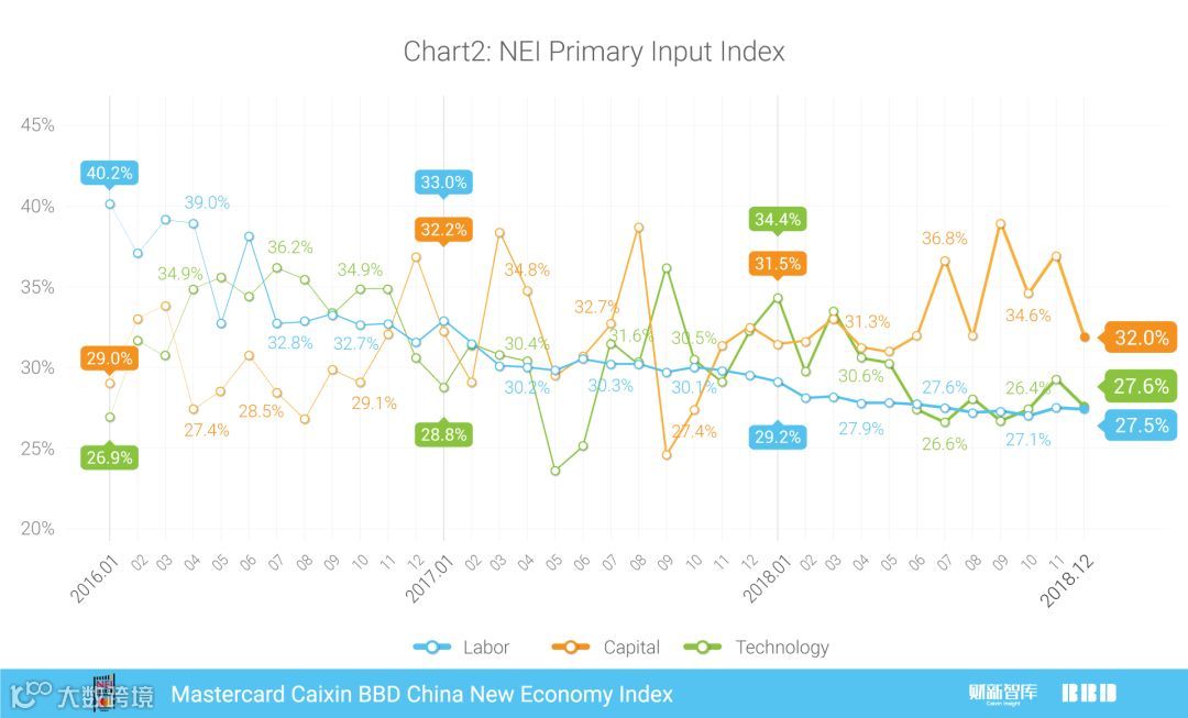 2018年12月,万事达卡财新BBD中国新经济指数(NEI)录得29.1,即新经济投入占整个经济投入的比重为29.1%。2017年以来,NEI指数波动较大,按可比口径计算,本月NEI比上月下降2.2个百分点(图1)。本月NEI的下降主要来自资本投入的下降。