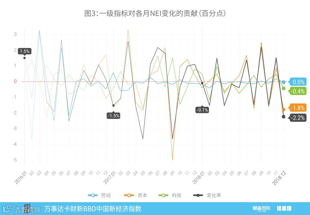 劳动力、资本和科技投入的变化百分比分别为0.0,-1.8,和-0.4个百分点,与权重相乘求和后,对2018年12月NEI变化的贡献值为-2.2%(图3)。